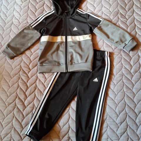 Adidas verkkaripuku lapsille, koko 104. Pukuun kuuluu hupullinen vetoketjullinen takki ja pitkät housut. Väri on musta kultaisilla raidoilla. Materiaali on kevyttä ja hengittävää verkkarikangasta. Hyvä käytetty kunto. Housuissa pientä nukkaantumista. Rinnassa Adidas merkin a repsottaa (kuva). Muutoin varsin hyvä kunto.