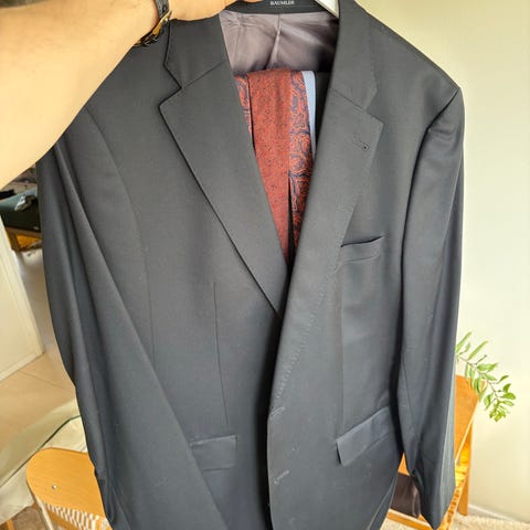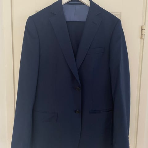 Dressmann miesten puku, koko 50. Sininen. Housut kokoa W36-L30, mutta kavennettu vyötäröstä, eli oikeammin about W34 athletic, eli tilaa reisille hieman tavallista enemmän.