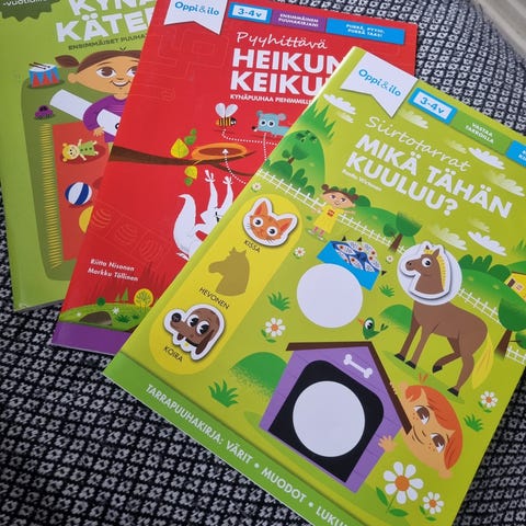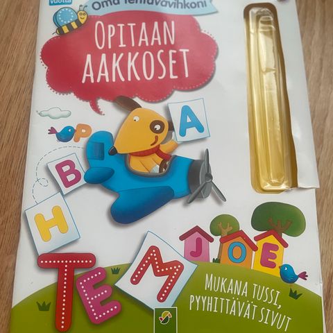 Oppi ja ilo pyyhittävä tehtäväkirja. Ikäsuositus 3-4v, mutta ihan kiva vielä 5v:lle kans. Tussi ei tule mukana. 4e