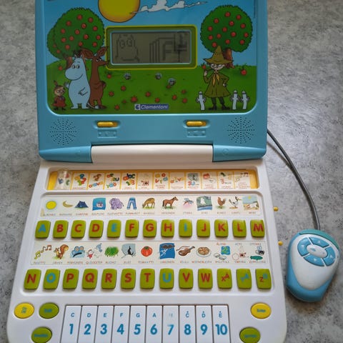 Muumi lasten oppimislelu, kirjainkannettava, jossa on sininen kotelo ja Muumi-hahmojen kuvitus kannessa ja sisäpuolella. Lelussa on näppäimistö, jossa on A–Ö-kirjaimet sekä kuvia kirjaimiin liittyvistä esineistä ja hahmoista. Sisäpuolen taulussa on vastaavat kirjaimet ja kuvat, jotka tukevat kirjainten ja sanojen harjoittelua. Sopii lapsille kirjainten ja perussanojen opetteluun leikin kautta. Toimii kannettavan tietokoneen muotoisena oppimisleluna, joka sulkeutuu kotelon sisään säilytystä varten.