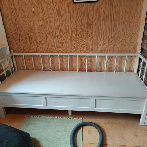 Levitettävä puinen vuodesohva, pohja vaneria. Pituus 198 cm, leveys levitettynä 108 cm. Nouto Äänekoskelta.