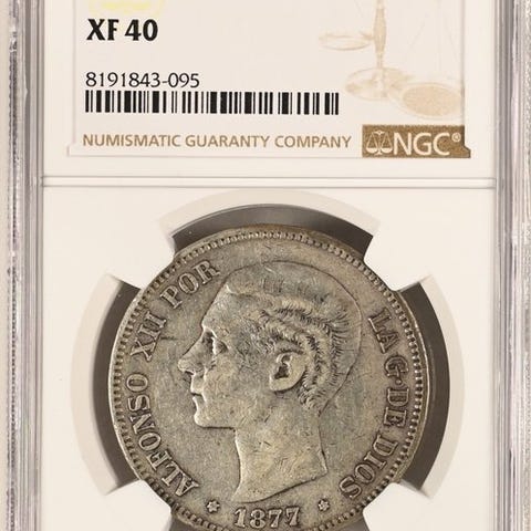 Alfonso XII:n viiden pesetan kolikot kapseloituina NGC:n toimesta.
