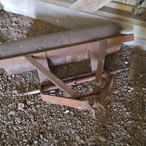 Useista teräksisistä rullaelementeistä koostuva jyräosa. Väri punainen, pinnassa näkyvissä ruostetta ja käytön jälkiä..