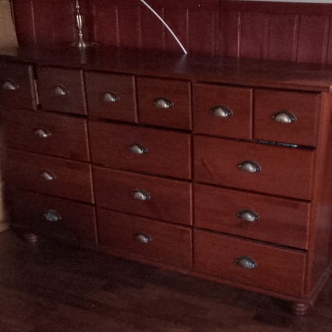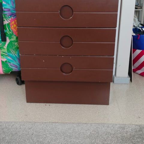 Ruskea/mahonginruskea lipasto. Laatikostot toimii moitteetta. Naarmuja ja jälkiä tarroista pinnassa jonkin verran. Nouto kerrostalon 2.kerros.