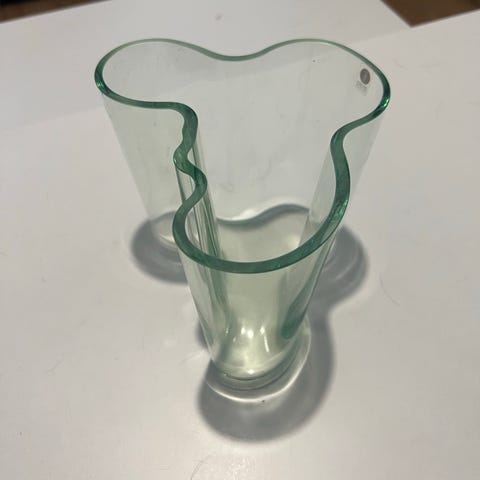 Iittala Aalto maljakko kirkasta lasia, väri vedenvihreä. Pohjassa Alvar Aalto 100, Iittala 1998 kaiverrus. Korkeus 9,5 cm. Orgaanisen aaltoileva muoto sopii esimerkiksi kukkien, oksien tai kynttilöiden esillepanoon sekä sisustusesineeksi. Maljakko on läpinäkyvää lasia ja sen muoto mahdollistaa erilaisten asetelmien teon.