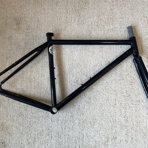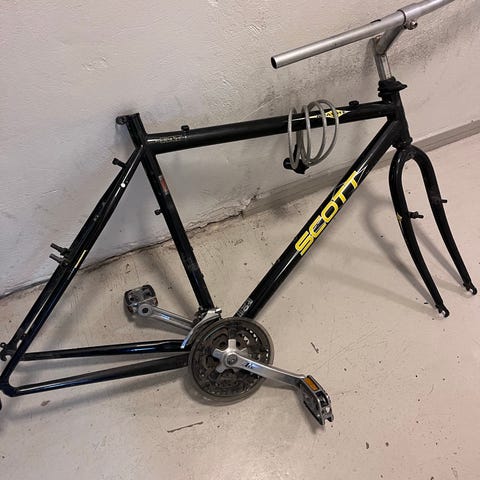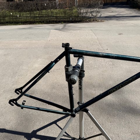 Siistikuntoinen runko, normaalia pientä jälkeä näkyvissä. Tässä rungossa ei ole ollenkaan maalia vaan pelkkä ed-pinnoite. Myös takavaihtajan vaijerin vienti on normaali vaijerilla oleva eikä siis kokopitkää suojakuorta. Näistä on erillaisia runkoja liikenteessä. Myöskään irrallista vaihtajankorvaketta ei ole antaa mukaan.