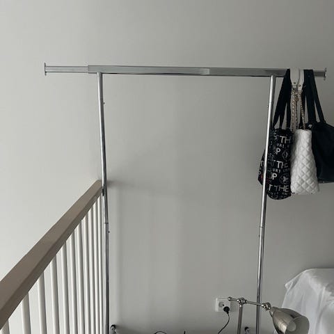 IKEA:n valkoinen metallinen Mulig vaaterekki. Teline seisoo vapaasti omilla jaloillaan. Soveltuu vaatteiden ripustamiseen henkarilla esimerkiksi makuuhuoneessa, eteisessä tai vaatehuoneessa.