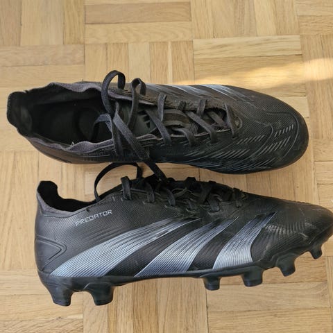 Adidas Predator jalkapallokengät. Sininen päällinen, valkoiset raidat ja punainen sisävuori. Nappulapohja on suunniteltu erityisesti jalkapallon pelaamiseen nurmikentillä. Nauhakiinnitys mahdollistaa istuvuuden säätämisen. Soveltuu jalkapalloharjoituksiin ja -otteluihin. US koko 8/1/2 eli vastaa noin 41-42 EU kokoa.