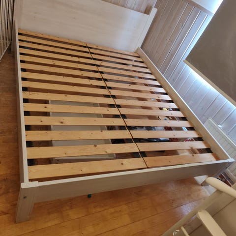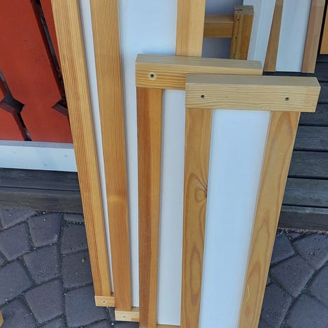 Puinen sängyn runko kehikko. Korkeus on hatusta vedetty kun en nyt pääse mittaamaan. Patjan alle tarvii säleikön tai muun pohjan. Ehjä ja siisti, kaikki kiinnitysosat tallessa. Vain nouto.