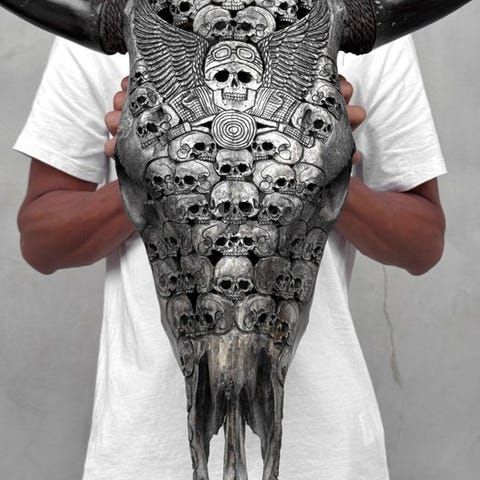 Suuri kivilaserointi käsin kaiverrettu Hereford- tai härkäluu-skrø numerologinen? A large hand engraved bull skull, engraved by craftsmen who passed the ancient art of engraving from father to son. The skull has been fully carved by hand with much care. It is an unusual, decorative piece. Engraved is a beautiful Human Skull Biker Motif. APPROXIMATE DIMENSIONSHeight: 54 cmWidth: 64 cmNOTE:- We’ve added some pictures of our craftsmen at work to give an impression of what the process of creating a carved skull looks like.- THE WEIGHT MENTIONED IS INCLUDING PACKING MATERIAL.DISCLAIMERS- The horns will be detached for transport purposes, and are easily reattached. The horns are always packed in the bottom of the box, underneath the skull. Please make sure to remove the horns before discarding the packaging.- Since it is a natural skull, it might have some natural minimal cracks, crevices or missing teeth. This is normal. Please refer to the pictures.- Our skulls are cleaned professionally, but sometimes minor discolouration still occurs on the teeth. This is natural and normal, and not something we can do a lot about. Please refer to the pictures.THE SHIPPING-The item will be sent with a Track & Trace code via DHL Parcel, DPD or postNl. The tracking will be updated in your Catawiki lot once your parcel has been dropped off. -Please check regularly to avoid your parcel being returned to us, in which case the buyer will be responsible for the shipping costs of the 2nd shipment.-For tracking to Spain and Portugal please use this link and add the tracking number from your Catawiki lot https://clientesparcel.dhl.es/LiveTracking/Home-WE DO NOT COMBINE SHIPPING!!!-If you have any questions about your parcel please contact us using the Catawiki message service. We will try to reply within 3 working days.