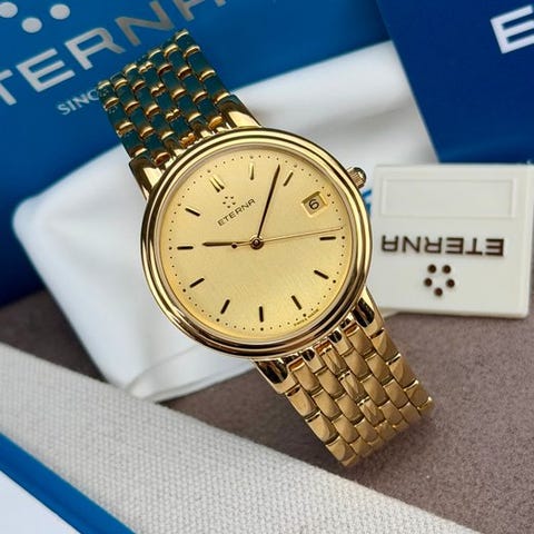 Upea Eterna-kello Rialto Classic -mallistosta. Kellon voimaa ohjaa laadukas kvartsikoneisto. Varustettu selkeällä kellotaululla, jossa kontrastiset yksityiskohdat, ja siinä on päivämääränäyttö klo kolmen tuntimerkkiä vasten. Kellon kotelo on teräs- ja kultauksella viimeistelty kaksivärinen.Uusi ja käyttämätön!Kellon päällä on mukava teräs-/kultauksesta koostuva ranneke.Toimitetaan laatikon, sisälaatikon ja tyhjän kortin kanssa kuten näkyy.Kellon koneisto: kvartsikoneistoKotelon materiaali: teräs / kultausKokojen Ø: noin 35 mm ilman krooninta.Rannenauhan pituus: noin 19 cm sis. kellon.Ikä: 2020+Toimitetaan vakuutetusti.Kuvat ovat osa kuvausta.