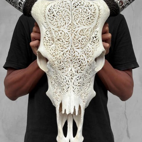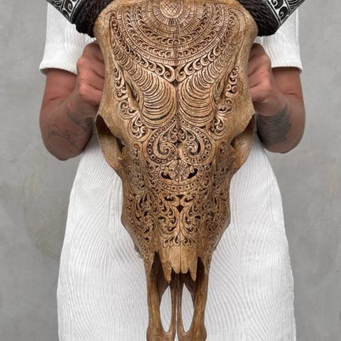 Hiottu lehmän kallon pää on upea kodin sisustusesine, joka elävöittää jokaista kotia tai ravintolaa. Se on enemmän kuin vain hengellinen ja kulttuurinen taideteos; se kertoo myös Indonesian alkuperäisyyskäsityöläisten tarinan, jotka säilyttävät paikallisen perinteen käyttää jokaisen eläimen osan käsityön taiteeksi ikuiseksi työksi. Tämä kallosseppätyö on valmistettu Indonesiassa, missä eläinkallon kaiverrustaidon periytyminen isältä pojalta opittiin. He ovat hallinneet tämän ovelan tekniikan ja siihen kuluu noin 5–6 päivää yksityiskohtaisten kaiverrusten, kuten tässä esimerkissä, tekemiseen. Sarvet on myös kaiverrettu boheemistyyliin.Kaiverrettu on kaunis Badong-majesteLÄHITUNTUMAN MITTASUHTEETPituus: 61 cmLeveys: 64 cmOHJEET JA TIEDOITUKSET- Kallon taakse on kiinnitetty nyöri, jotta se voidaan asentaa seinälle.- Kuljetuksen vuoksi sarvet irrotetaan, ja ne on helppo kiinnittää uudestaan. Sarvet on aina pakattuna laatikon pohjalle kallon alle. Kun heität pakkauksen pois, varmista, että poistat sarvet.- Koska kyseessä on luonnontuote, kallossa saattaa olla luonnollisia pieniä halkeamia,uurteita tai puutteellisia hampaita. Tämä on normaalia. Katso kuvat.- Kallomme puhdistetaan ammattilaiskaikin, mutta joskus hampaisiin saattaa silti tulla pieniä värivaihteluita. Tämä on luonnollista ja normaalia, eikä sitä voi tehdä paljon toisin. Katso kuvat.- Olemme lisänneet kuvia käsityöläisistämme työn äärellä antamaan käsityksen siitä, miltä kallon kaivertamisen prosessi näyttää.- MÄÄRÄTYY NIMETTY PAINO SISÄLTÄÄ PAKKAUSTALÄHETYSKohta tuote lähetetään seurantakoodin kera DHL Parcelin, DPD:n tai postNl:n kautta. Seuranta päivittyy Catawickin huutokauppapaikalla, kun paketti on jätetty lähetykseen. Säännöllisesti tarkista, ettei pakettiasi palautuisi meille, koska tällöin ostaja vastaa toisen lähetyksen toimituskustannuksista.Seurantaan Espanjaan ja Portugaliin käytä tätä linkkiä ja lisää Catawiki-tilauksesi seurantanumerohttps://clientesparcel.dhl.es/LiveTracking/HomeEMME YHDISTÄ KULJETUKSIA!!!Jos sinulla on kysyttävää pakettisi suhteen, voit ottaa meihin yhteyttä Catawiki-viestipalvelun kautta. Pyrimme vastaamaan 3 työpäivän kuluessa.