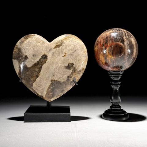 Ihastuttava pari petrifioidusta puusta – sydämenmuotoiset kappaleet ja pallo