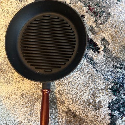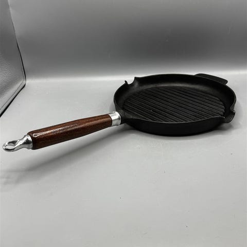 Ronneby Bruk Maestro grillipannu, jossa on puinen kahva. Pannun halkaisija on noin 25 cm ja kokonaispituus noin 48 cm. Valmistettu Ruotsissa. Ronneby Bruk on tunnettu ruotsalainen keittiövälineiden valmistaja, joka on erikoistunut valurautatuotteisiin.