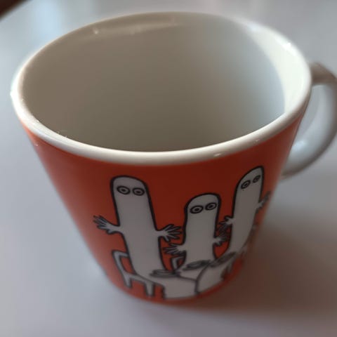 Paljon käytetty. Pieniä piste vaurioita lasitteessa. Sisäpuolella myös kulumaa. Ehjä kyllä. Helsingin Sanomat teema mallin muki.