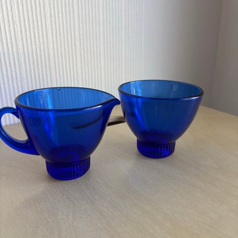 1960-luvun kermakko ja sokerikko vihreää lasia. Kermakossa tarra Kumela Riihimäki.