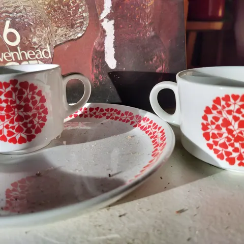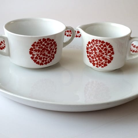 Design Raija Uosikkinen, 1970-luku. Kermakko ja sokerikko, joissa on punainen koriste.