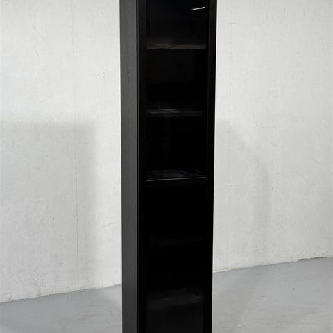 Kapea musta kirjahylly, jossa on lasiovet ja useita hyllytasoja. Valmistettu Saksassa ja suunniteltu tarjoamaan käytännöllistä säilytystilaa.