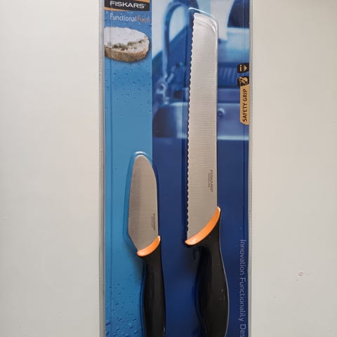 Fiskars Functional Form -sarjan yleisveitsi ja Roll-Sharp -teroitin. Veitsi on noin 32 cm kokonaispituudeltaan.