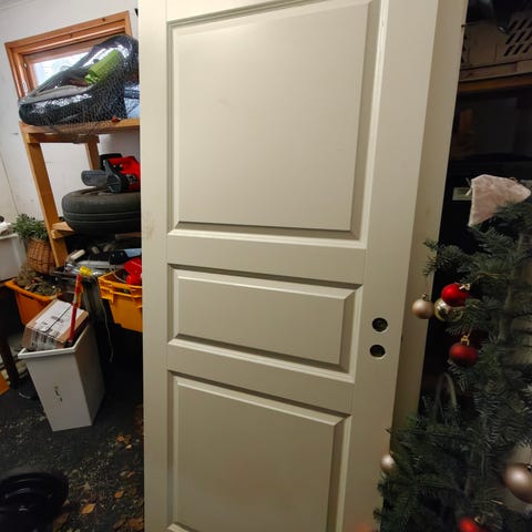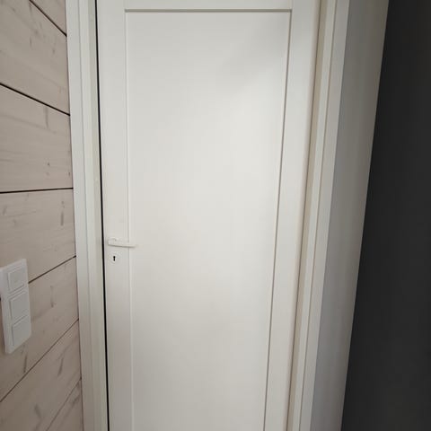 Valkoinen sisäovi. Perinteinen, sileäpintainen ovi. Kunto hyvä.