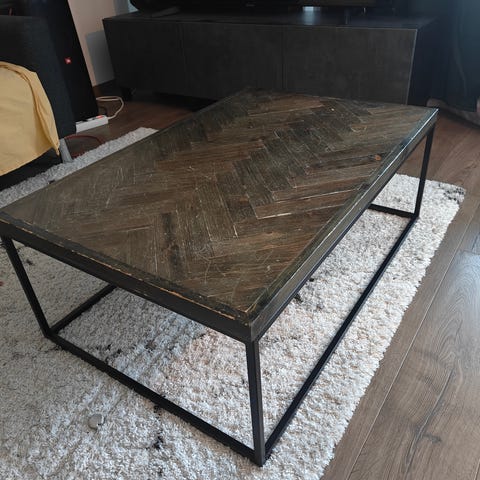 Kiilto-Valkoinen tukeva siisti sohvapöytä. Jalkojen kohdalla kannessa pienet kohoumat, kuin poratapit olisi koholla. HP.10€