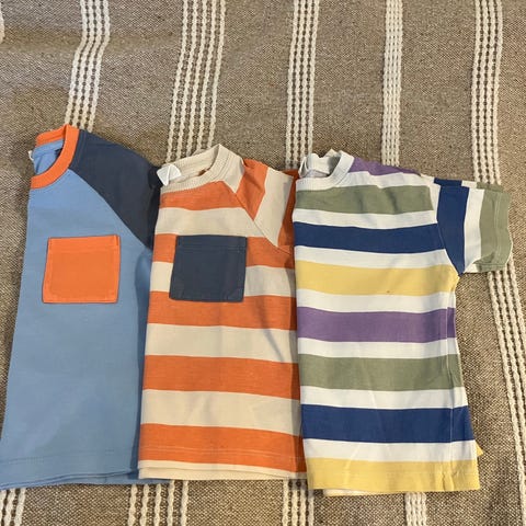 Kolme H&M lasten t-paitaa, koko 86. Värit ja kuosit kirjavat: yksi raidallinen paita, yksi yksivärinen paita kontrastihihalla ja rintataskulla sekä yksi paita palmuprintillä.