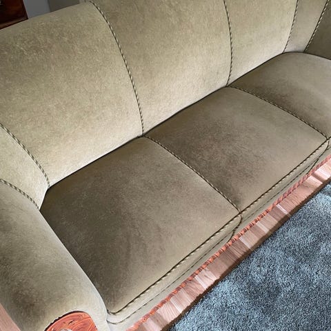 Sohvassa kestävä laadukas kangas, joka ei ole mennyt juuri miksikään. Muutama tahra löytyy, jotka saa viltillä piiloon, voin koittaa vielä pestä, ei ole vain tuota tekstiilipesuria että sillä saattaisi lähteä paremmin