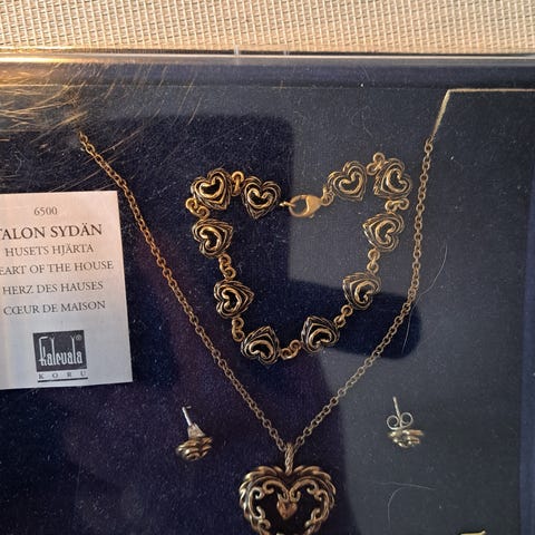 Talonsydän sarjan pronssiset korvanapit sekä rannekoru ja lisäksi myös korvarenkaat sekä kaulaketju.