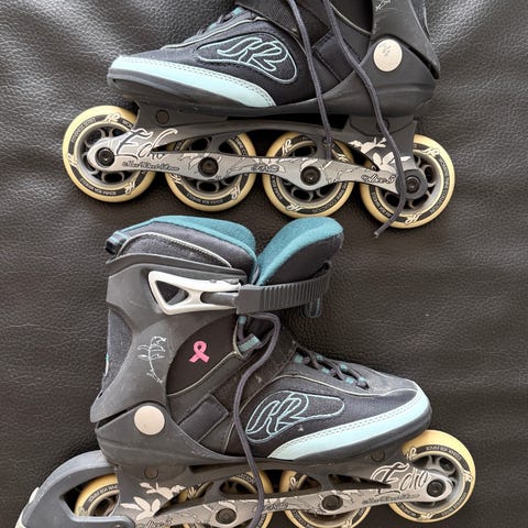 K2 rullaluistimet rullaluisteluun, koko 37. Väri musta turkooseilla yksityiskohdilla. Luistimissa tukevat kovamuoviset kuoret ja pehmustettu sisäkenkä. Kiinnitys tapahtuu nauhoilla, tarranauhalla ja solkikiristyksellä. Alumiinirunko ja neljä rengasta per luistin, takana jarrupala toisessa luistimessa. Soveltuvat vapaa-ajan rullaluisteluun.