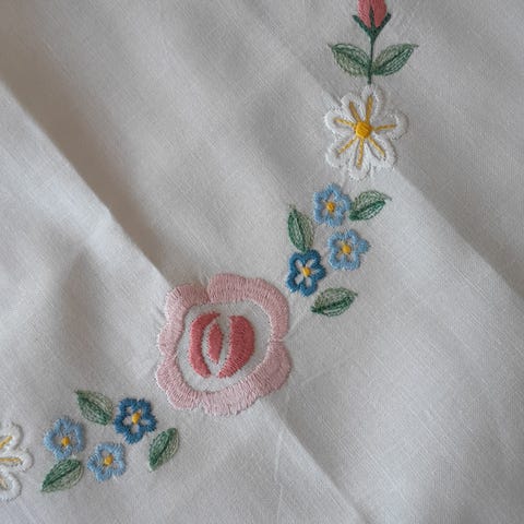 Myydään 100% puuvillaa oleva kukkakuvioinen pöytäliina kokoa 88x86cm. Reunukset beigen/vaalean ruskean väriset. Liina on täysin käyttämätön.