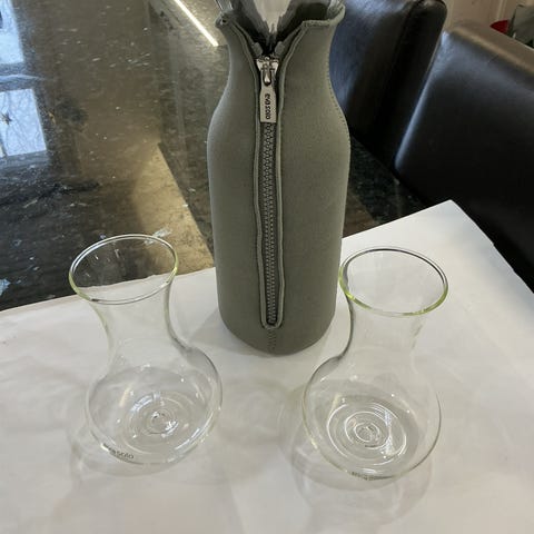 Eva Solo lasikannut teräskorkilla. Kannut on valmistettu kirkkaasta lasista, ja niissä on ruostumattomasta teräksestä ja muovista valmistetut kaatokorkit.