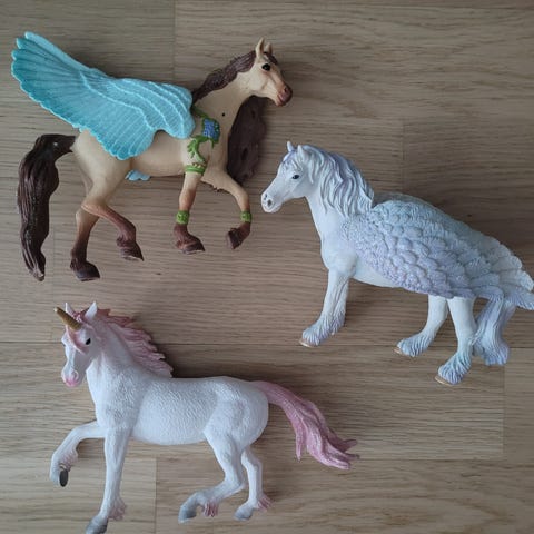 Myydään kuvien neljä Schleich-hevosta (yksi taitaa olla yksisarvinen).