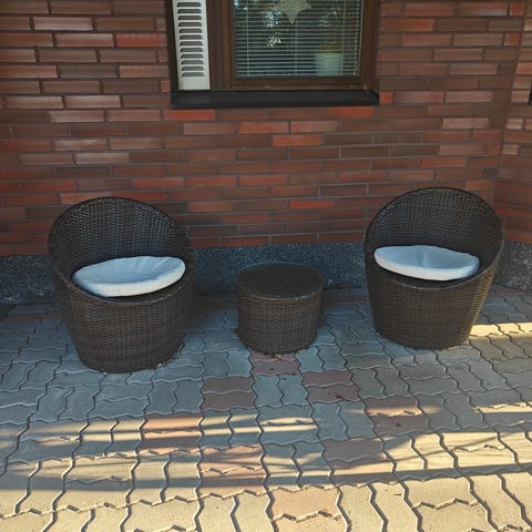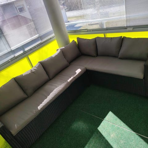Kalusteet ovat kunnoltaan hyvät, muutamasta kohdasta polyrotinki purkautunut. Ilmoituksessa näistä erilliset kuvat nähtävissä.