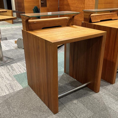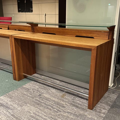 Tukeva ja raskas pöytätaso tai tiski, jossa on lasinen yläosa ja puun värinen runko. Tiskin alla on metallinen jalkatuki ja takana lippa, jonka taakse saa esim. sähköpistokkeet piiloon.