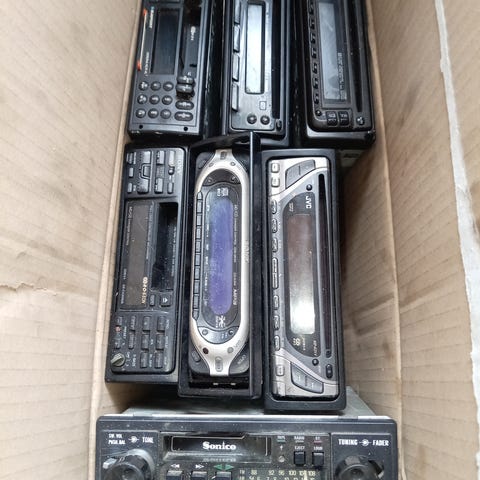 Nippu soittimia joita ei ole kaikkia testattu. Pioneerin uudemmassa radio toimii ja kasettikin jotenkin mutta puuttuu nappi. Vanhempi Pioneer radio löytää kanavia mutta potikat rätisee reilusti. Vdo muistaakseni testattu joskus tais toimia. Muista ei siis tietoa.