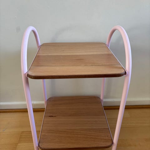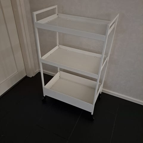 Pieni, soma hylly. Itsellä ollut aikoinaan käytössä kosmetiikalle. Valkoisissa hyllyissä on jotain likaa, lähtee todennäköisesti puhdistamalla. Hyllytasoja pystyy liikutella niin, että ne ovat mieluisalla korkeudella.