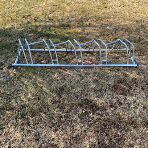 Metallinen polkupyöräteline kolmen pyörän säilytykseen. Hinta 25 €. NOUTO,en siis postita. Käteismaksu