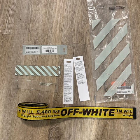Off-White Industrial -vyö, unisex-malli. Keltainen tekstiilivyö, jossa musta Off-White -logopainatus koko pituudelta. Musta metallinen solki, jossa kaiverrus. Vyö on pitkä ja säädettävissä eri vyötärönympäryksille, sopii käytettäväksi sekä housujen kanssa että asusteena vyötärölle tai lantiolle.