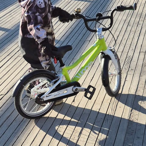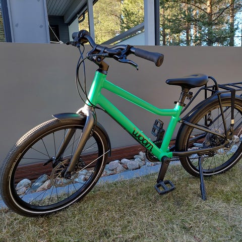 Vihreä woom 4. Käsijarrut ja vaihteet toimii. Käytönjälkiä löytyy, mutta toiminnassa ei puutteita.