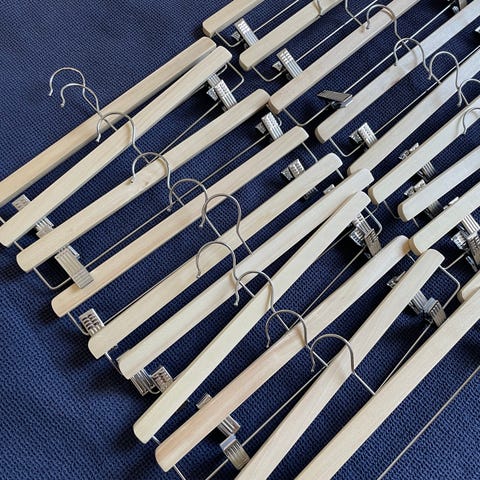Sininen lasten henkari ja 9 kpl aikuisten erivärisiä henkareita.