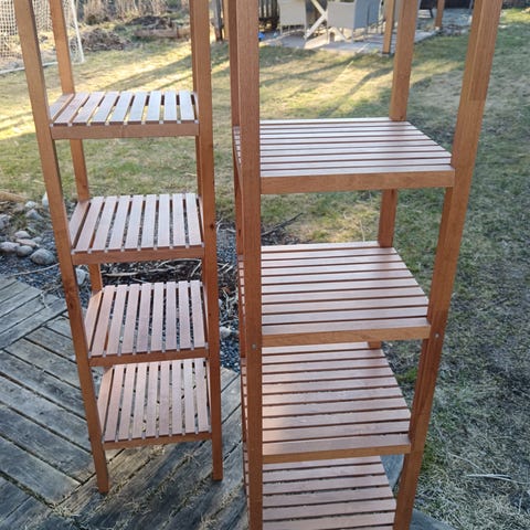 Puinen sälepenkki ja hyllykkö. Penkissä on kaksi tasoa ja metallijalat. Hyllykössä on useita säletasoisia hyllyjä ja yläreunassa kehikko kantamista tai tavaroiden rajaamista varten. Molemmat kalusteet ovat puunvärisiä. Olleet kylpyhuoneessa, säilytetty pyyhkeitä yms. Pientä käytönjälkeä on. Savuton, homeeton, koirakoti. Nopea nouto etusijalle. Yhteishinta.