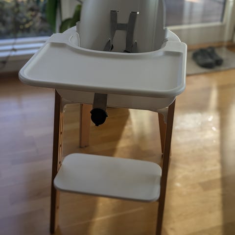 Stokke steps juniorituoli. Painoraja 85 kg, säädettävä jalkatuki. Tuolin jalat puuta, kokonaisuuden muoviosat valkoiset.