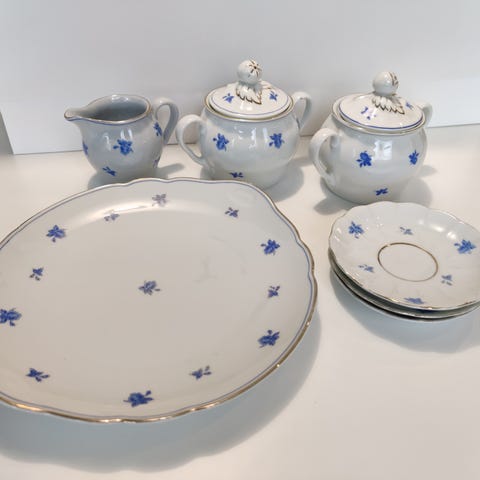 Arabia sininen ruusu kahvikupit ja lautaset. Kupit ja lautaset ovat koristeltu sinisillä ruusukuvioilla ja kultareunuksilla. Piippuleima.5kpl kuppi, 7kpl tassi.Kupit ja lautaset ovat hyvässä kunnossa ilman näkyviä vaurioita.