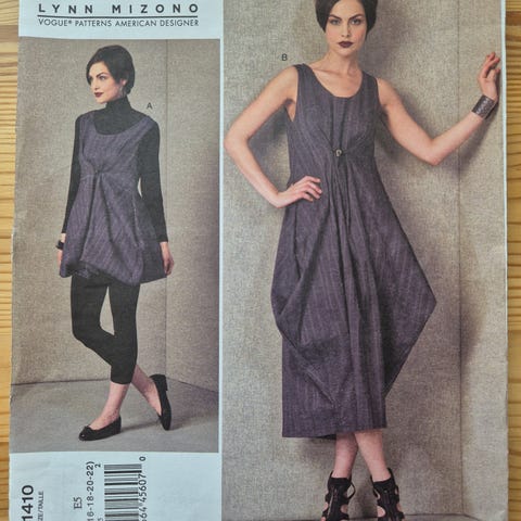 Vogue V1219 kaavapaketti naisten mekkoon. Malli on polvipituinen, hihaton mekko, jossa on kietaisumainen yläosa, istuva yläosa ja leveä, laskostettu helma. Kaava sisältää useita kokoja (koot näkyvät pakkauksessa) ja on tarkoitettu kudotuille kankaille, kuten puuvillalle, pellavalle tai vastaaville. Pakkaus sisältää kaava-arkit ja ompeluohjeet mekon valmistamiseen.