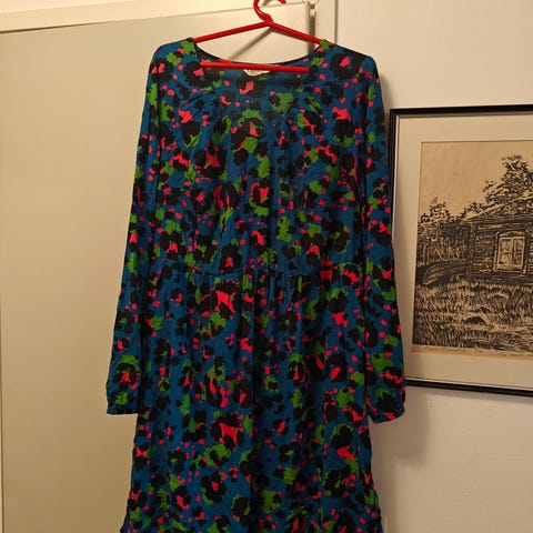 Puna-violettikirjava mekko. Koko 52-54. Matetiaali 95% viskoosia ja 5% elastaania. Pitkät hihat. Pieni röyhelö pääntiessä.