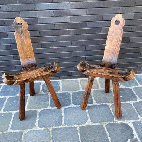 Kaksi viehättävää espanjalaista kolmijalkaa tuolia massiivisesta veistetystä puusta. Niitä käytettiin aiemmin lapsen syntymän yhteydessä. Irrotettavissa. Selkänojan korkeus 72 cm, istuinleveys 41 cm ja istuinkorkeus 38 cm.