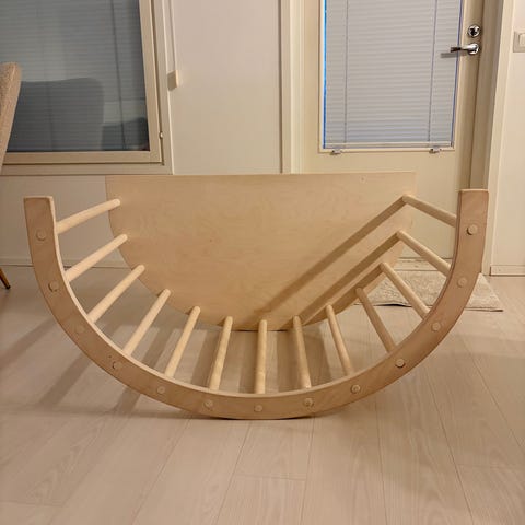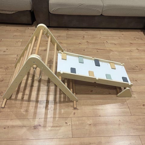 Puinen lasten kiipeilykaari ja liukuramppi. Kaarimallinen kiipeilyteline koostuu useista pyöreistä puupuolista, joiden päälle voidaan asettaa irrotettava liukuramppi. Ramppi toimii sekä liukumäkenä että kiipeilytasanteena. Materiaalina on vaalea puu, ja kokonaisuus soveltuu sisäkäyttöön lapsen motoristen taitojen harjoitteluun ja leikkeihin. Kuvissa näkyy myös erillinen kolmionmuotoinen puinen lauta, joka voi toimia esimerkiksi lasten leikki- tai sivupöytänä.