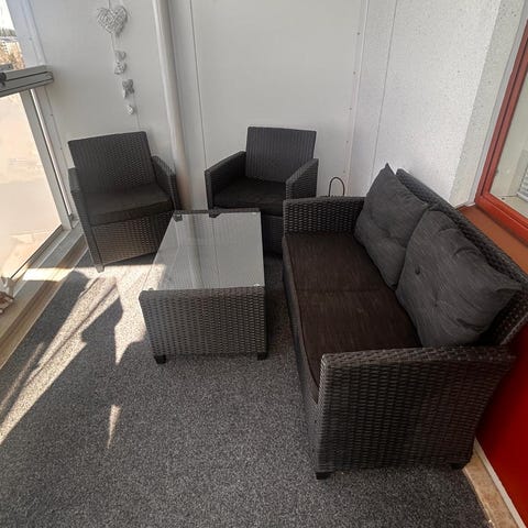 Polyrottinkinojatuoli 1kpl + pehmusteet ja pyöreä pöytä halkaisija 70cm ja korkeus 43cm.