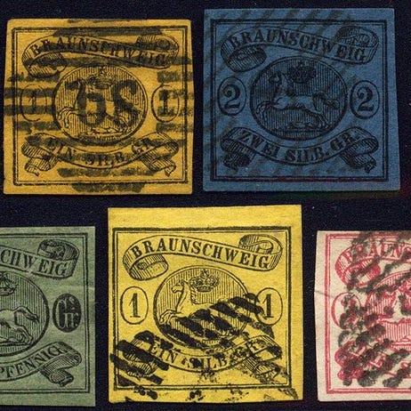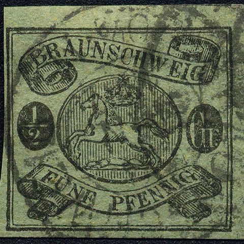 Vanha-Saksa Braunschweig, 1861, Michel-Nr. 10 A, 'Vaakuna ovaalissa', leimattu, vahvempi keula alhaalla. Allekirjoitus Georg Bühler, Michel = 500 €