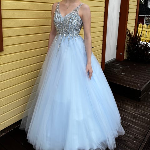 Tummansininen glitterinen vanhojentanssi mekko. Mekko on kokoa XS, selässä nauhat joilla saa kiristettyä sopivaksi. Uskon että menee myös S kokoiselle. Mekosta on leikattu ala helmaa, mutta sitä ei kaukaa huomaa. Olen itse 163cm ja tanssin air forceilla. Mekko on muuten hyvässä kunnossa. Pukupussin saa myös mukana💗.